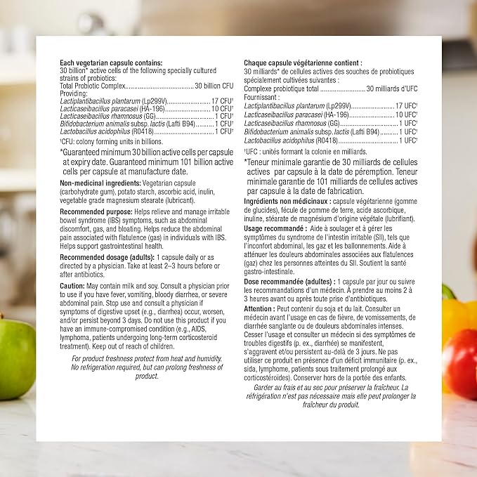 Each vegetarian capsule contains:30 billion* active cells of the following specially cultured strains of probiotics:Total Probiotic Complex30 billion CFU Providing:Lactiplantibacillus plantarum (Lp299V)17 CFU†Lacticaseibacillus paracasei (HA-196)10 CFU†Lacticaseibacillus rhamnosus (GG)1 CFU†Bifidobacterium animalis subsp. lactis (Lafti B94)1 CFU†Lactobacillus acidophilus (R0418)1 CFU††CFU: colony forming units in billions.*Guaranteed minimum 30 billion active cells per capsule at expiry date. Guaranteed minimum 101 billion active cells per capsule at manufacture date.