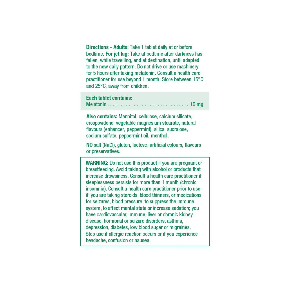 Take 1 tablet at or before bedtime. Do not drive or use machinery for 5 hours after taking melatonin. Consult a healthcare practitioner for use beyond 1 month. For jet lag: For occasional short-term use, take once a day at bedtime after darkness has fallen while travelling, and at destination, until adapted to the new daily pattern. Store between 15°C and 25°C, away from children.