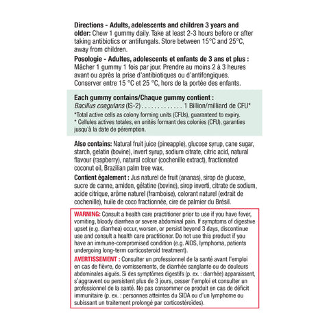 Chew 1 gummy daily. Take at least 2-3 hours before or after taking antibiotics. Store between 15° and 20°, away from children.