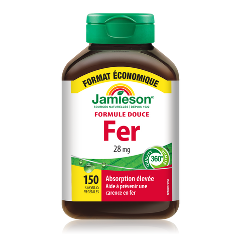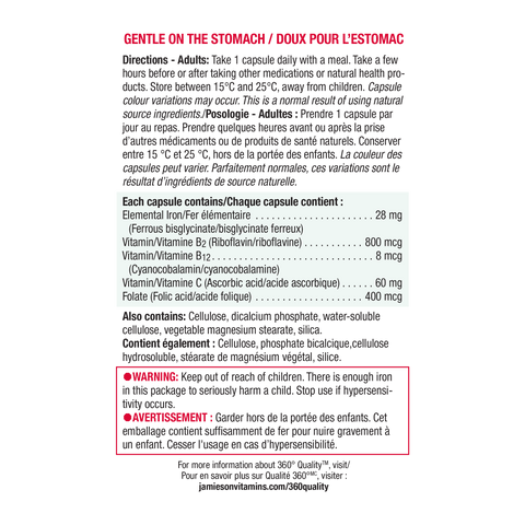Jamieson 高吸收温和铁是铁、叶酸、维生素 B2、B12 和维生素 C 的混合物,它们结合在一起提供快速吸收,维持健康的免疫系统,同时对胃温和。