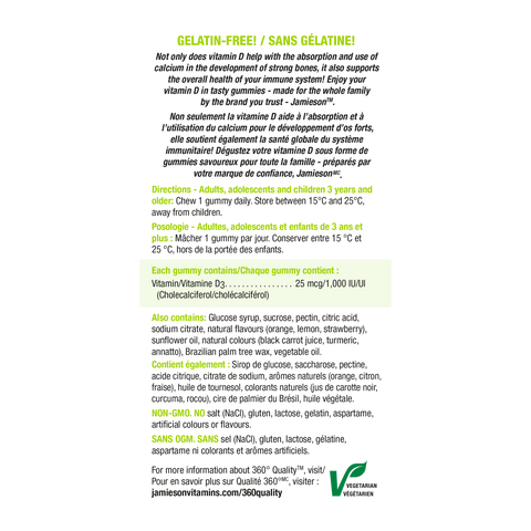 Jamieson 維生素 D3 軟糖 1,000 IU 味道極佳,純天然,可提供 1,000 IU 純淨、天然來源的維生素 D3。