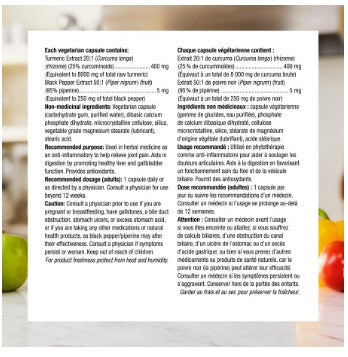 如果您懷孕或哺乳、患有膽結石、膽管阻塞、胃潰瘍或胃酸過多,或者如果您正在服用任何其他藥物或天然保健品,請在使用前咨詢醫生,因爲黑胡椒/胡椒堿可能會改變其效力。如果症狀持續或惡化,請咨詢醫生。請將本品放在兒童不能接觸的地方